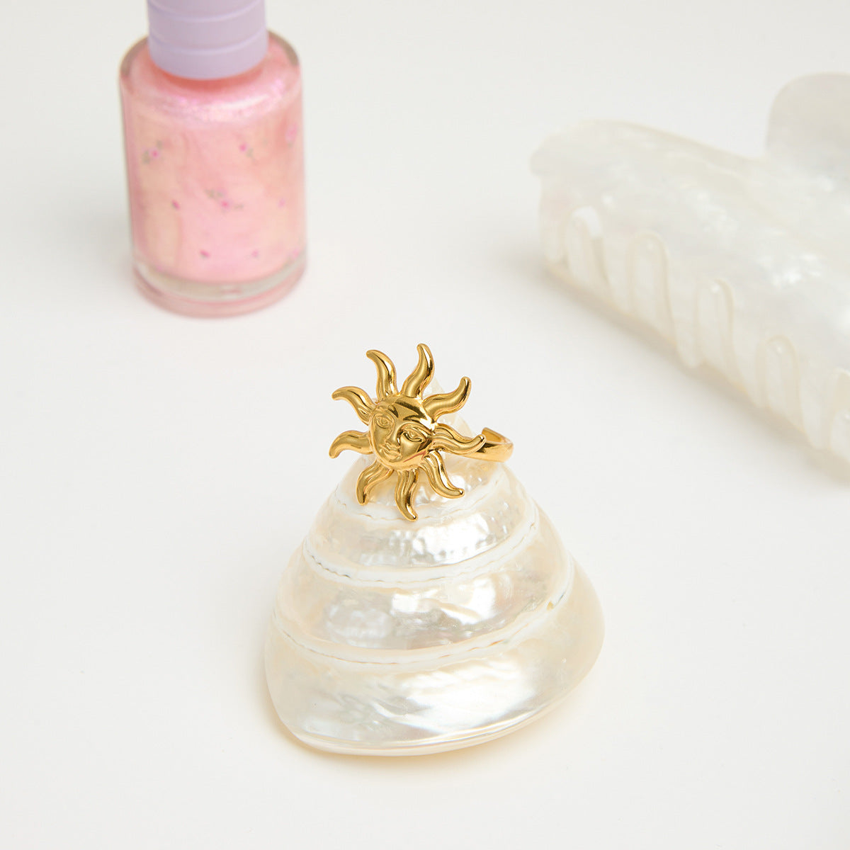 Un diseño llamativo y lleno de energía positiva. Este anillo ajustable en forma de sol con rostro tallado está elaborado en acero inoxidable dorado, resistente y de alta calidad. Su acabado brillante lo convierte en una pieza única, perfecta para quienes buscan un accesorio diferente y con estilo. Ideal para llevar solo como protagonista o combinarlo con otros anillos para un look más atrevido.