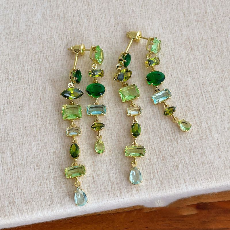 Estos aretes son la definición de elegancia moderna. Su diseño alargado con cristales en diferentes formas y tamaños crea un movimiento súper luminoso que estiliza el cuello y roba miradas en cualquier ocasión.