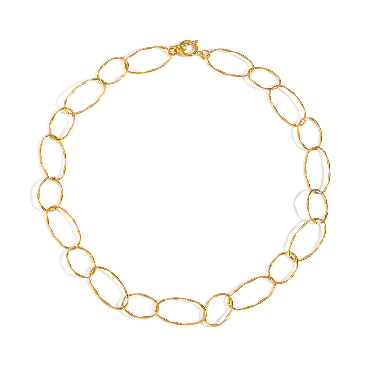 Un clásico moderno que nunca pasa de moda. Este collar de eslabones ovalados es el toque perfecto para elevar cualquier look, ya sea casual o elegante. Su brillo dorado y diseño versátil lo convierten en una pieza imprescindible en tu colección.