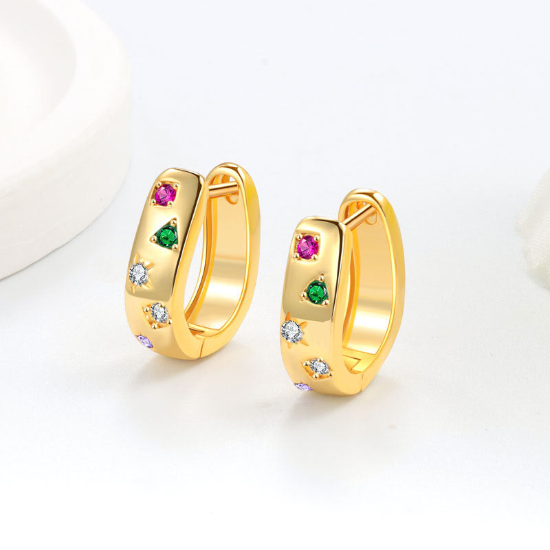 Eleva cualquier look con estos aretes tipo huggie de diseño moderno y toques de color. Están hechos de cobre con chapa de oro/plata y decorados con circonias en tonos vibrantes como rosa, verde, blanco y lila, creando un estilo fresco, elegante y súper combinable.